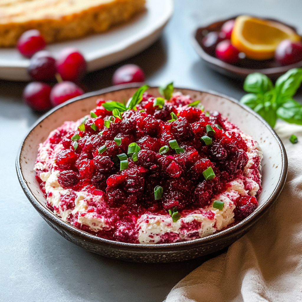 Baked Cranberry Cream Cheese Dip is a delicious appetizer that combines the tangy flavor of cranberries with the creamy texture of cream cheese. This dish is typically baked until bubbly and golden, making it perfect for parties or holiday gatherings. The dip is often served with crackers, bread, or fresh fruit, offering a delightful contrast between savory and sweet. Its rich flavors and appealing presentation make it a favorite among guests.