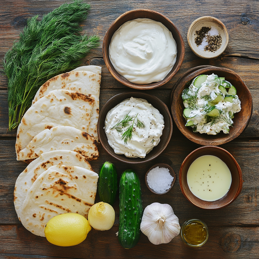2. Prepare Tzatziki Sauce: Grate cucumber and squeeze out excess moisture. In a bowl, combine Greek yogurt, grated cucumber, minced garlic, lemon juice, dill, salt, and pepper. Mix well and refrigerate.