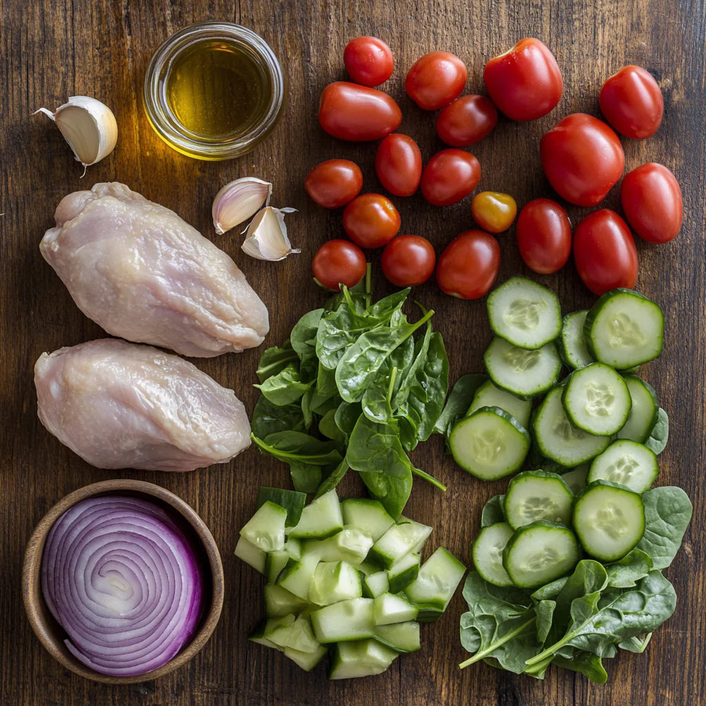 - While the chicken cools, chop mixed greens, cucumbers, cherry tomatoes, and red onion. Combine in a large bowl.