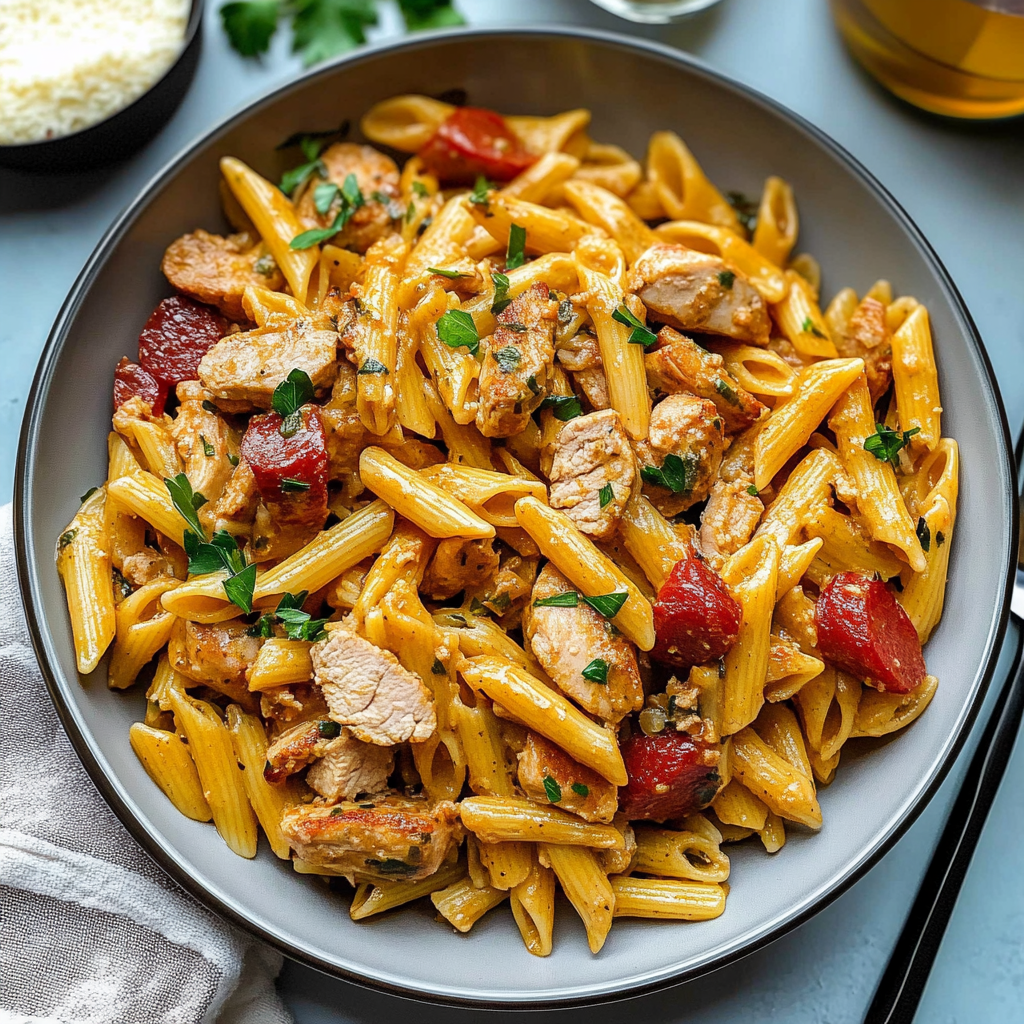 • This showstopping Creamy Cajun Chicken and Sausage Pasta delivers restaurant-quality results using simple ingredients you probably already have at home.