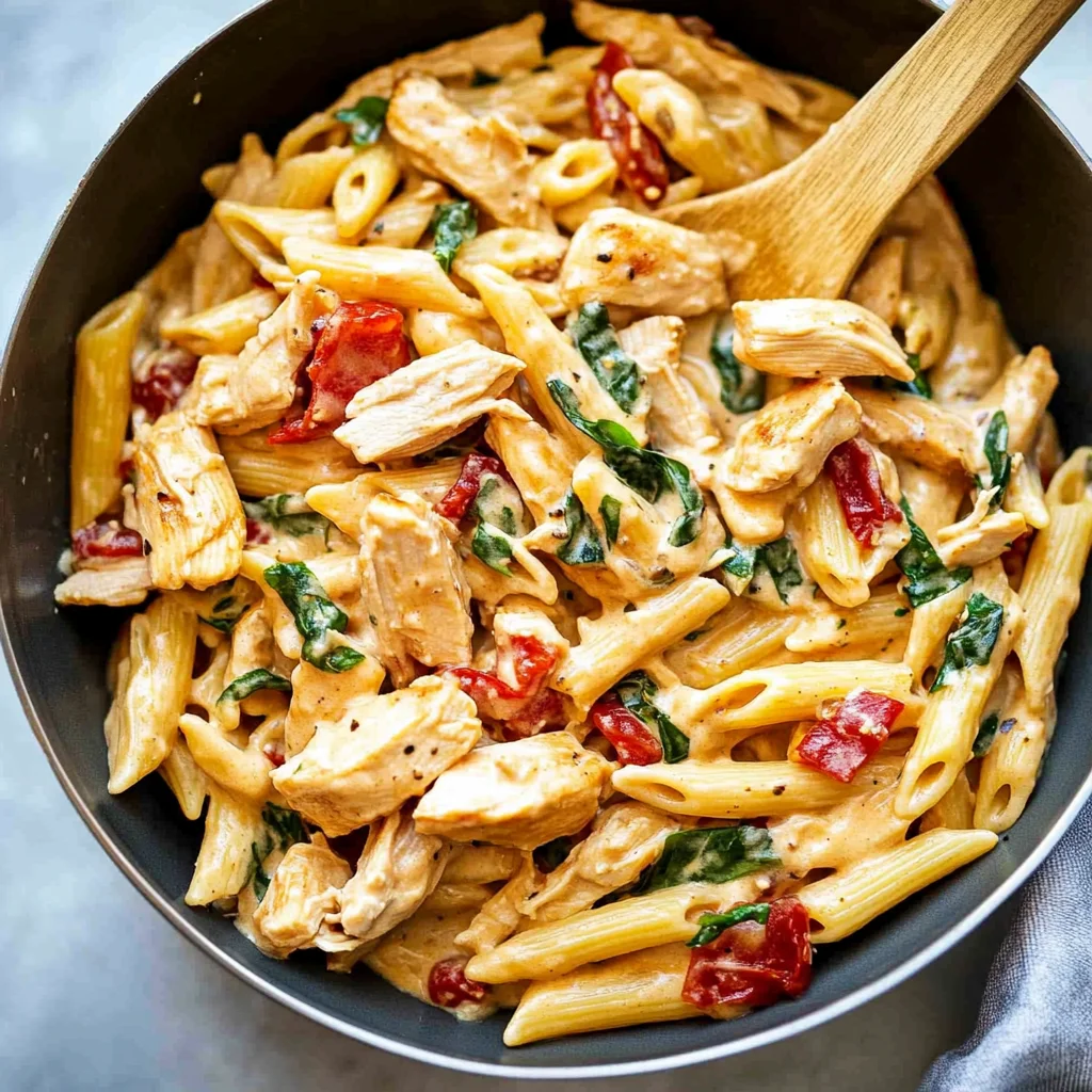 A rich and creamy pasta dish featuring succulent chicken, sun-dried tomatoes, and fresh spinach in a flavorful garlic sauce.