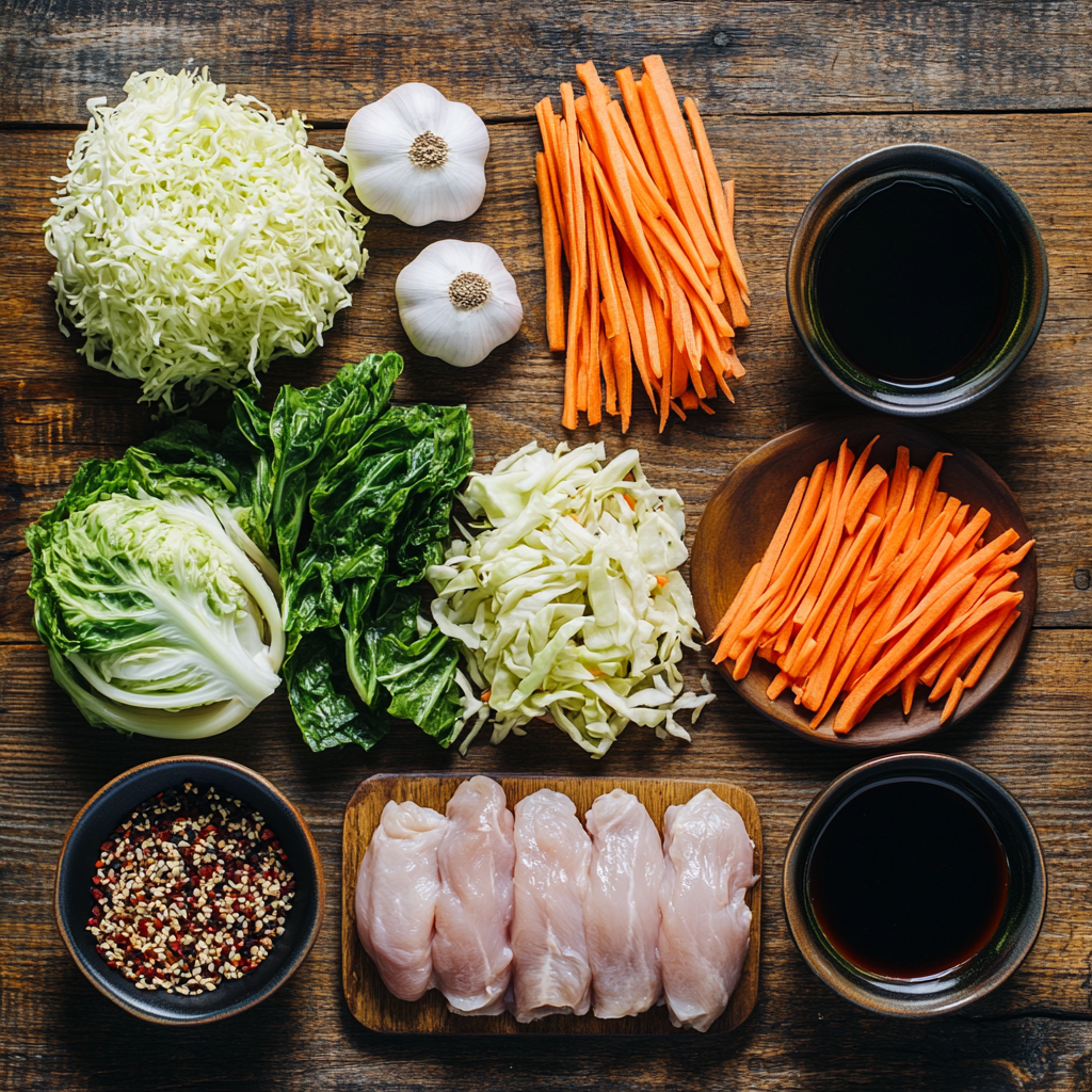 1. Prep all ingredients: slice chicken into strips, shred cabbage, and julienne carrots.