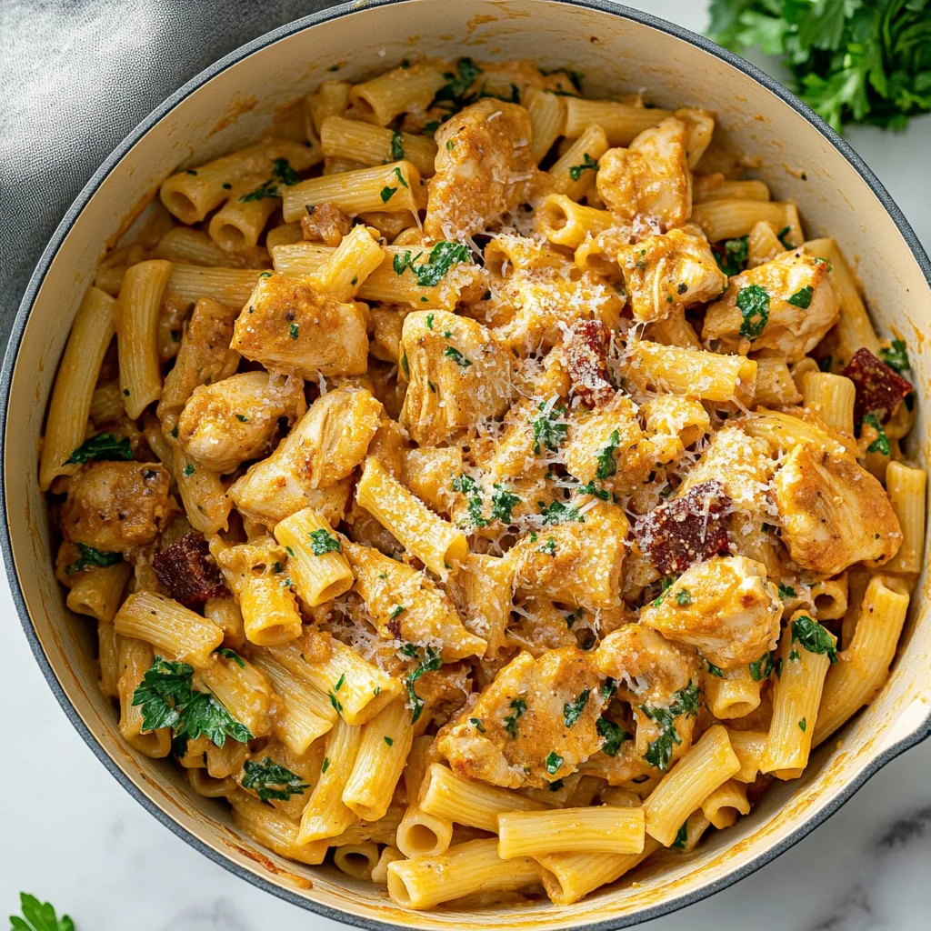 Step 4: Combine and Serve:It’s almost time to dig in! Slice the rested chicken and return it to the skillet with your luscious sauce. Stir gently to coat each piece in that creamy goodness. Now add your drained pasta into the skillet and toss everything together until well combined—watch those noodles soak up all that flavor! Cook for an additional minute to heat through. Finally, serve hot and don’t forget to garnish with chopped fresh parsley and extra parmesan cheese if desired; this adds a lovely touch both visually and flavor-wise.