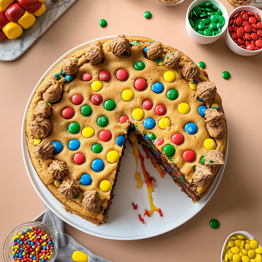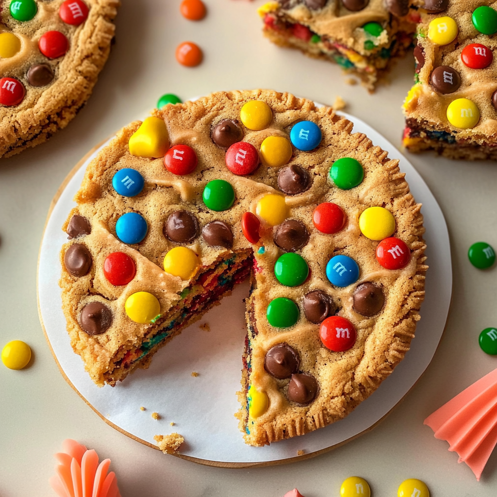 - M&M Cookie Cake is a delightful dessert that combines chewy cookie goodness with colorful chocolate bursts