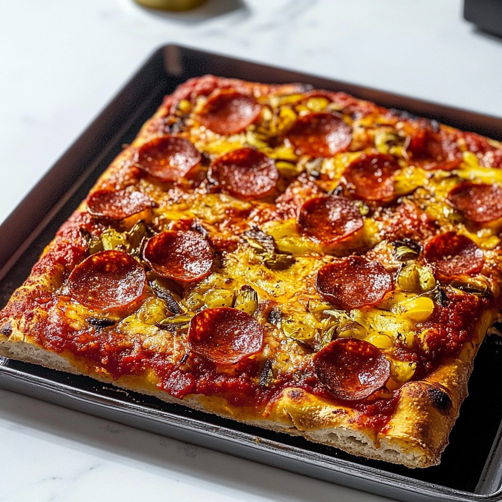 Pepperoni and Pickled Pepper Pan Pizza is a delicious twist on traditional pan pizza. This dish features a thick, crispy crust that holds a generous layer of tangy tomato sauce, melty cheese, spicy pepperoni, and zesty pickled peppers. The combination of flavors creates a unique taste experience. Perfect for pizza lovers looking to try something new, this dish combines the savory richness of pepperoni with the bright acidity of pickled peppers, making it an ideal choice for casual gatherings or family dinners.