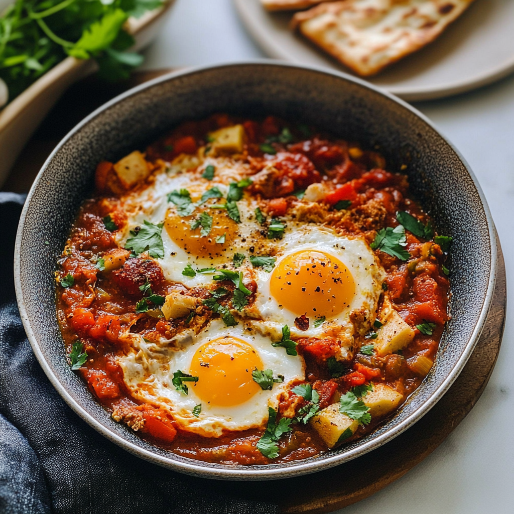 Shakshuka is a delicious and hearty dish that originates from North Africa and the Middle East. It typically consists of poached eggs cooked in a flavorful tomato sauce, often spiced with ingredients like cumin, paprika, and chili peppers. This dish is not only nutritious but also versatile, allowing for variations that include vegetables, cheese, or even meats. Traditionally enjoyed for breakfast, shakshuka has gained popularity worldwide as a satisfying meal at any time of the day.