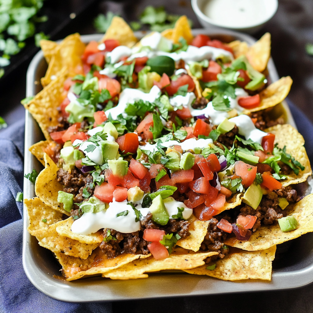 In summary, taco nachos represent a fun and flavorful dish that everyone loves. Their combination of crispy tortilla chips, seasoned meat, melted cheese, and customizable toppings makes them ideal for any occasion. Whether serving them at parties or enjoying them during movie nights at home, taco nachos always satisfy cravings. Try making this delightful recipe yourself and share it with family and friends! Enjoy the bold flavors of taco nachos today!