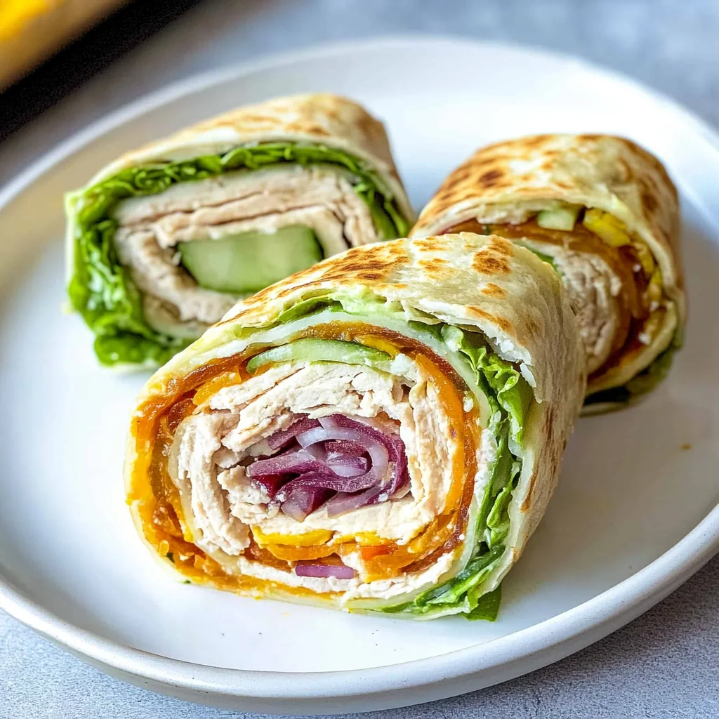 These wraps can be customized with your favorite vegetables or sauces. You can also substitute turkey with chicken or ham for variety.