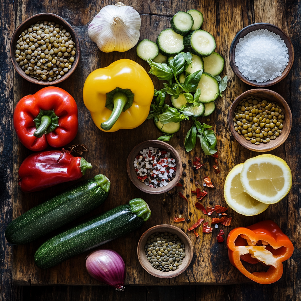 While those lentils are bubbling away like an excited cauldron, chop up bell peppers, zucchini, and red onion into bite-sized pieces. Get creative—don’t be afraid to mix colors!