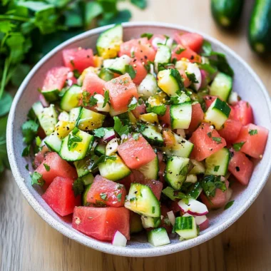 Imagine the juicy sweetness of ripe watermelon mingling with the crisp crunch of fresh cucumber, all brightened by a hint of zesty lime and fragrant mint in a vibrant watermelon cucumber salad. The colors pop like a summer sunset, inviting you to dive in and experience the refreshing, playful combination of flavors that dances on your palate.