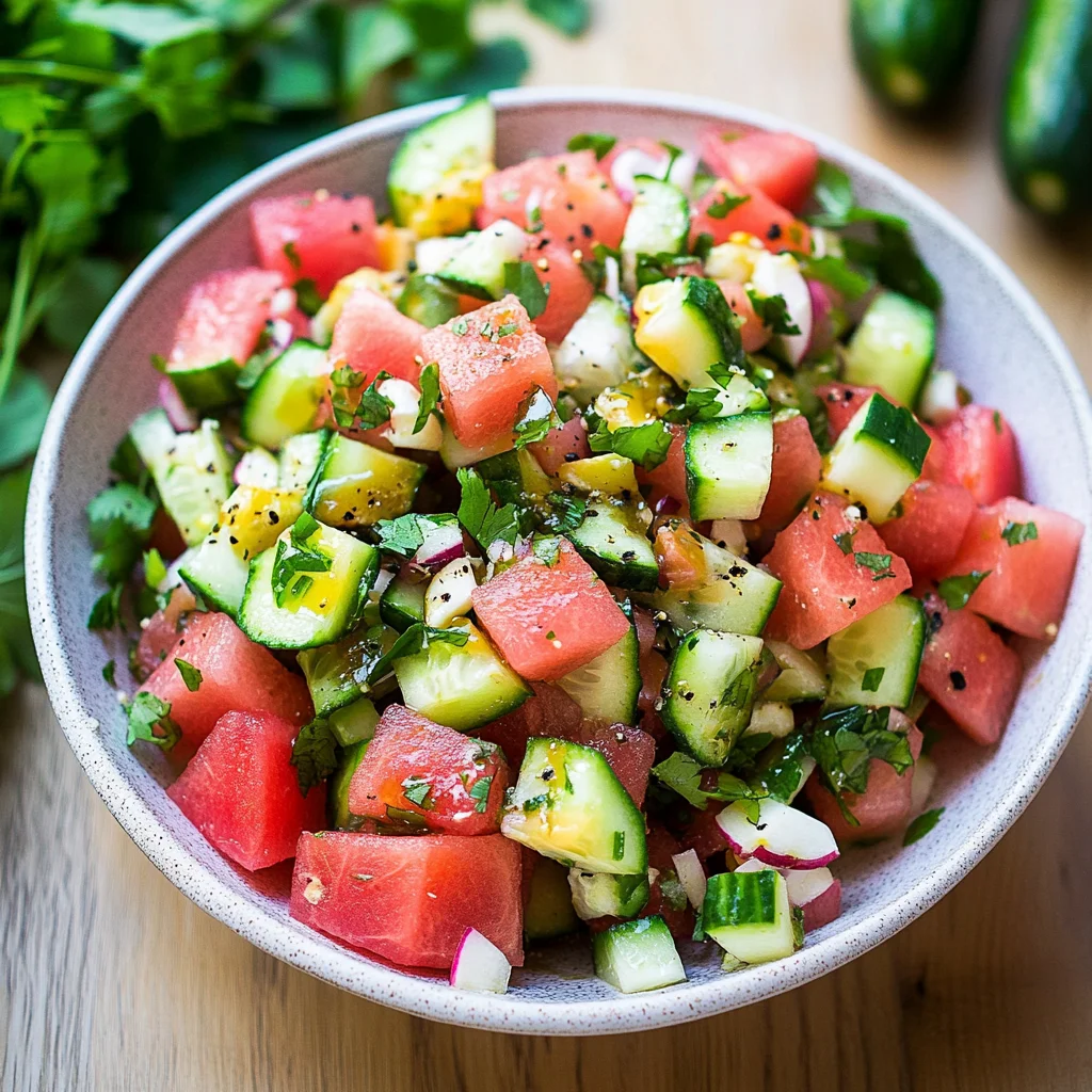 Your watermelon cucumber salad is perfectly done when the vibrant colors of the cubed watermelon and diced cucumber are bright and fresh, with the red onion adding a pop of contrast. The mint should provide a fragrant aroma, while each bite feels crisp and refreshing, balancing sweetness with a hint of acidity. Remember, small variations in texture and flavor are perfectly normal; trust your instincts!
